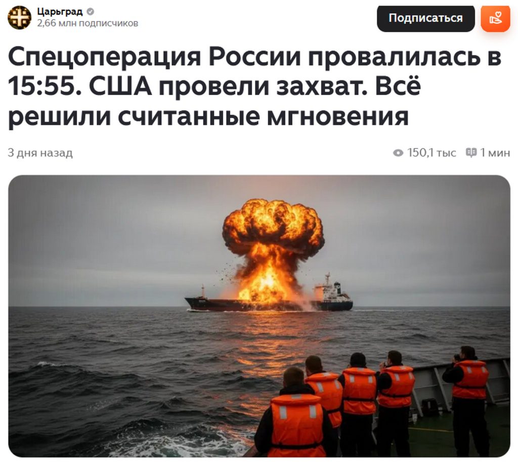 Als dann der Tanker Marinera von den Amerikanern geentert und festgesetzt wurde, titelte die Webseite des Propagandasenders „Zargrad“ wohl mit Absicht provokant: „Russlands Spezialoperation misslang um 15.55 Uhr. Die USA brachten das Schiff in ihre Gewalt. Alles entschied sich in wenigen Augenblicken.“