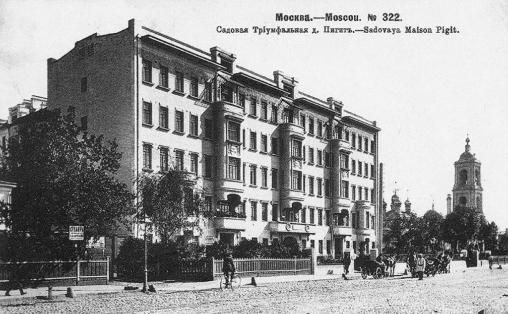 Dieses prächtige fünfstöckige Jugendstilhaus ließ sich 1904 der wohlhabende Moskauer Tabakfabrikant Ilja Pigit bauen. Er selbst bewohnte mit seiner Familie die größte Wohnung in der Beletage im ersten Stock, die anderen Wohnungen waren vermietet. Die Geschichte seines Hauses – es liegt in der Bolschaja-Sadowaja-Straße 10 – ist sehr gut dokumentiert, was einem berühmten Bewohner zu verdanken ist: Hier lebte von 1921 bis 1924 Michail Bulgakow mit seiner ersten Ehefrau Tatjana Lappa. Bulgakow hat das Haus in mehreren Erzählungen und in seinem Roman „Der Meister und Margarita“ verewigt. Heute ist die schöne Villa restauriert und zu einer Sehenswürdigkeit für Touristen geworden. Leider steht sie nicht mehr frei wie hier auf dieser alten Ansichtskarte, sondern wird auf beiden Seiten von hässlichen anderen Häusern eingeklemmt. Privatwohnungen gibt es darin auch nicht mehr, dafür beherbergt sie seit 1991 ein Bulgakow-Museum, außerdem viele Firmenbüros – u. a. residierte hier eine Zeitlang die Moskauer Vertretung von Rolls Royce.