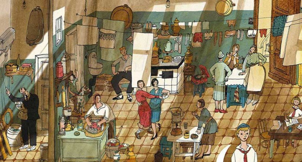 Bis zum Schluss befanden sich die meisten Kommunalwohnungen in „verdichteten“ Altbauten. Dann ließ Chruschtschow Ende der 1950er Jahre im großen Stil billige Plattenbausiedlungen mit abgeschlossenen Einzelwohnungen bauen – damit ging die Ära der Kommunalka allmählich zu Ende. Komplett sind sie zwar bis heute nicht verschwunden, die meisten gibt es noch in St. Petersburg. Aber es werden immer weniger, und sie werden schon seit langem als Überbleibsel der sowjetischen Vergangenheit betrachtet, bisweilen mit nostalgisch verklärtem oder getrübtem Blick. Viele Filme, meist Komödien, und Bücher tragen dazu bei. Sogar Museen zeigen inzwischen Ausstellungen zum Thema, die Besucher dürfen durch die nachgebauten Räume einer Kommunalka spazieren. So munter und vergnügt wie auf dieser Illustration ging es dort aber vermutlich eher selten zu.