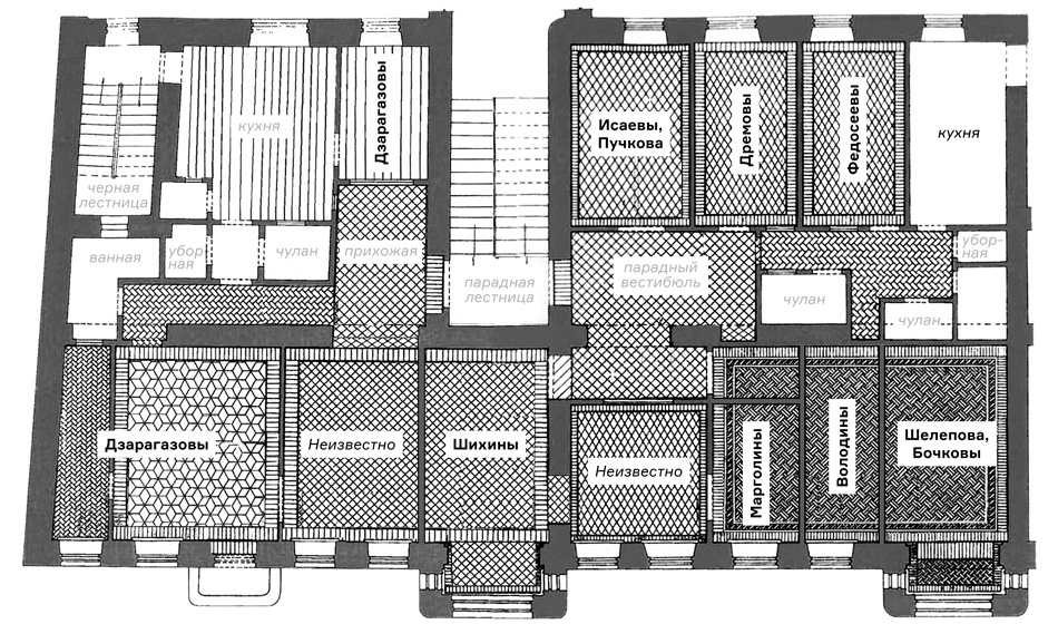 Die Wohnung war jetzt in zwei „Kommunalkas“ (Gemeinschaftswohnungen) geteilt, mit zwei Hausnummern, 5 und 5a. Im Arbeitszimmer links wurde eine Zwischenwand eingezogen, das große Wohnzimmer rechts war sogar in drei Räume für drei Famiien aufgeteilt. Im rechten Teil gab es eine weitere Küche, allerdings kein zweites Badezimmer, nur die schon vorher vorhandene Toilette. Insgesamt wohnten hier nun zehn Familien, zum Teil offenbar noch mit einer zusätzlichen alleinstehenden Person: vorn rechts z. B. die Familie Botschkow mit einer Frau Schelepowa oder hinten neben der Treppe eine Familie Issajew und eine Frau Putschkowa. Das Gedränge und Gewusel und auch den Lärm bei so vielen Bewohnern kann man sich unschwer vorstellen.