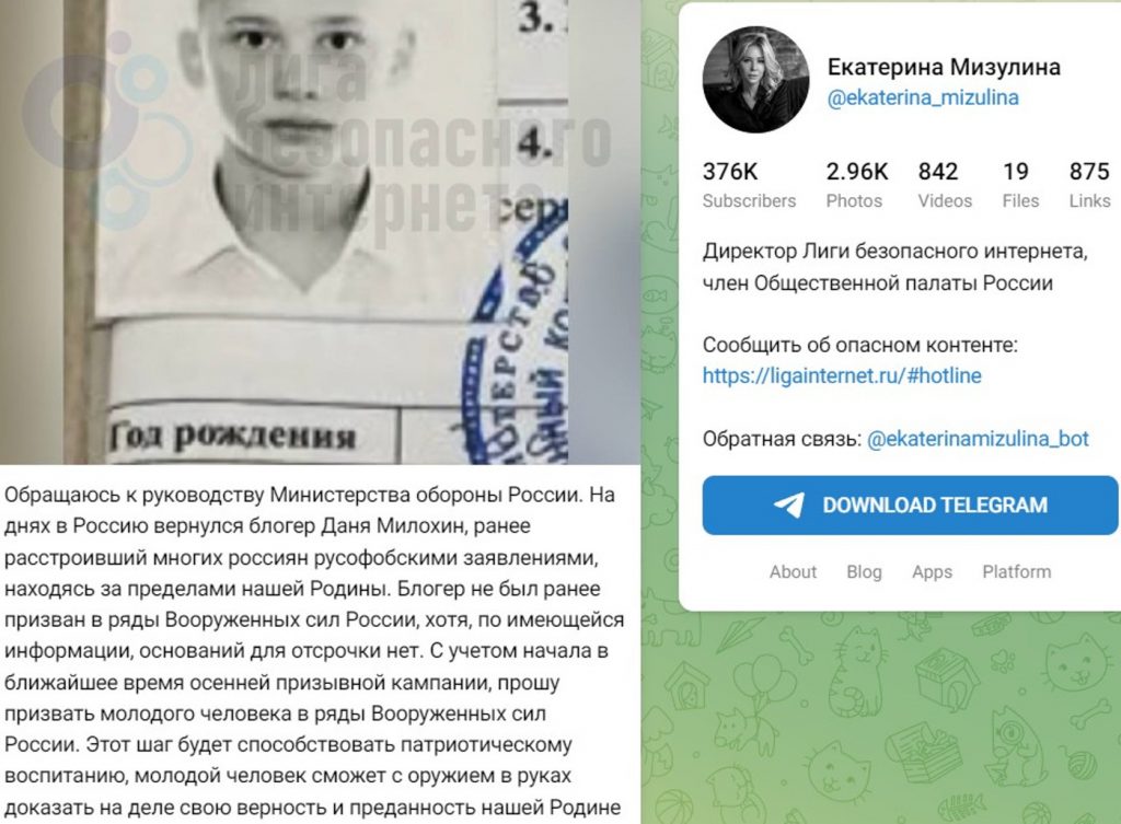 Ich wende mich an die Leitung des Verteidigungsministeriums von Russland. Vor Kurzem ist der Blogger Danja Milochin nach Russland zurückgekehrt, der viele russische Bürger mit russophoben Äußerungen verstört hat, während er sich im Ausland aufhielt. Der Blogger wurde bisher nicht zum Wehrdienst einberufen, obwohl es nach den vorliegenden Informationen keine Gründe für einen Aufschub gibt. Mit Blick auf die demnächst beginnende Herbstkampagne zur Mobilmachung bitte ich darum, den jungen Mann in die russische Armee einzuberufen. Diese Maßnahme wird seine patriotische Erziehung fördern, der junge Mann kann mit der Waffe in der Hand aktiv seine Treue und Ergebenheit unserer Heimat gegenüber beweisen.
