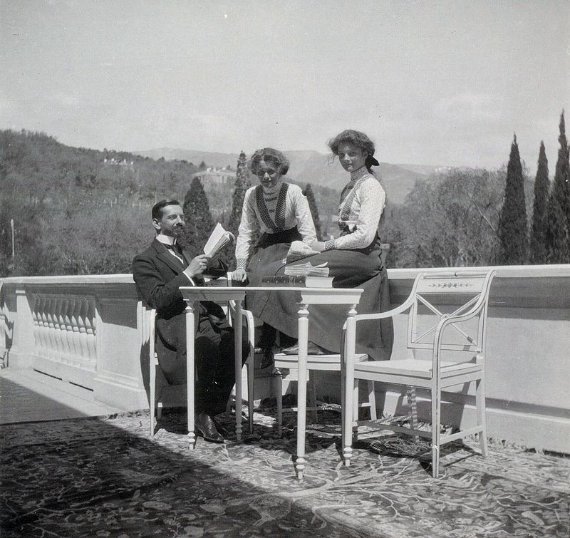 1922 veröffentlichte ein anderer ehemaliger Hauslehrer seine Erinnerungen, die noch weit mehr Leser fanden und bis heute finden. Seine Zöglinge waren noch berühmter als die Tolstoj-Kinder, und ihr Schicksal bewegte die Welt. Pierre Gilliard, geboren 1879 im Schweizer Kanton Waadt, wurde 1904 von der Zarenfamilie als Französischlehrer für die vier Töchter und ab 1913 vorwiegend für den kleinen Zarewitsch engagiert. Im Laufe der Zeit entwickelte sich zwischen Gilliard und der Zarenfamilie eine persönliche Beziehung, ja Freundschaft, die weit über ein Arbeitsverhältnis hinausging. Gilliard begleitete die Familie auf Reisen und in die Ferien. Das Foto zeigt ihn mit den Großfürstinnen Olga und Tatjana 1911 in der Sommerresidenz Liwadija auf der Krim.