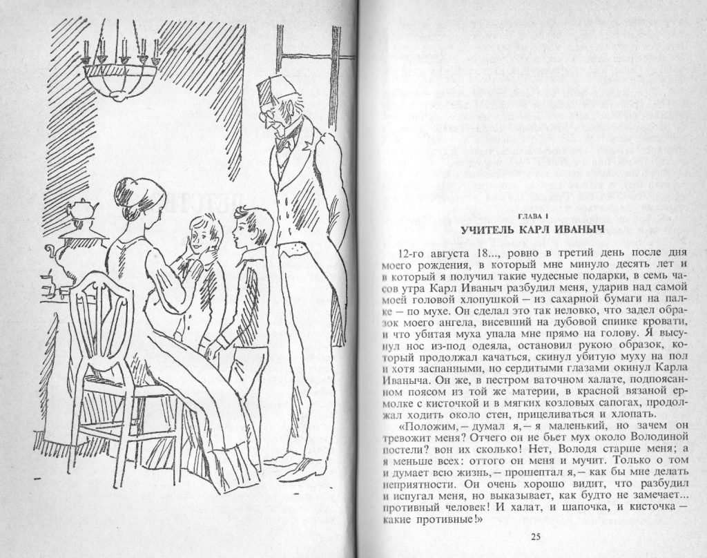 Der Abschnitt aus Leo Tolstojs Buch ist zitiert nach der Ausgabe „Kindheit und Knabenalter“, übersetzt von Hanny Brentano, 1911, zu finden im Projekt Gutenberg. Die Illustration von L. Selisarow stammt aus der russischen Ausgabe des Buches, Leningrad 1978.