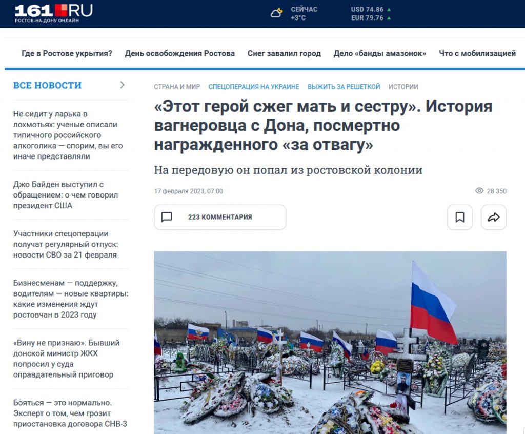 Von Roman Lasaruk weiß man genau, wo er sich die letzten acht Jahre aufhielt. 2014 setzte Lasaruk im Verlauf eines heftigen Streits seine Mutter und seine jüngere Schwester bei lebendigem Leibe in Brand und kam dafür in eine Strafkolonie mit verschärftem Regime. Aber die festgesetzten 17 Jahre saß er nicht ab – im September 2022 schloss er sich dem Söldnerkorps Wagner an, und im Dezember fiel er bei Bachmut. Posthum erhielt er die Tapferkeitsmedaille. Im Februar wurde er in einer Reihe mit Soldaten der Armee begraben. Irina Babitschewa, Korrespondentin von 161.ru, erzählt, wie die Beerdigung Lasaruks im Bergarbeiterstädtchen Donezk (nicht zu verwechseln mit der gleichnamigen Millionenstadt in der Ostukraine, d. Ü.) im Gebiet Rostow aufgenommen wurde.